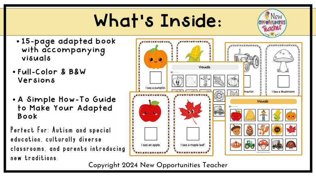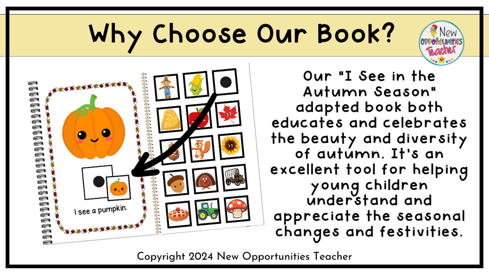 Our "I See in the Autumn Season" adapted book both educates and celebrates the beauty and diversity of autumn. It's an excellent tool for helping young children understand and appreciate the seasonal changes and festivities.