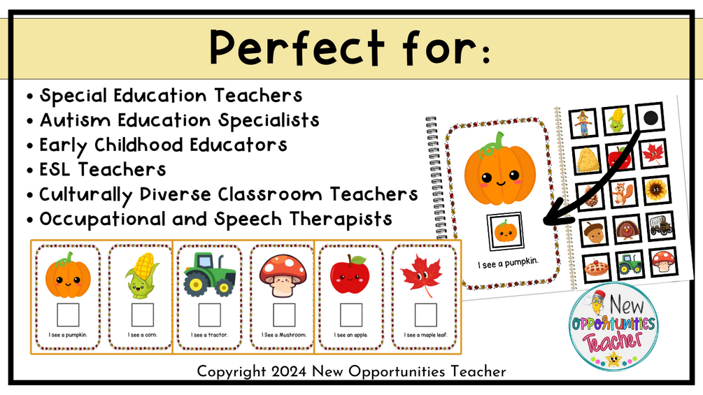 Celebrate the beauty of autumn with our engaging and interactive adapted book, "I See in the Autumn Season." This 11 x 8.5 inch interactive book is designed to captivate young minds and foster a love for the changing seasons. Perfect for autism and special education settings, this book provides an enriching experience for all students.